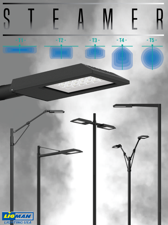 The Steamer can be utilized to suit specific light patterns using the asymmetrical type II, III, IV and symmetrical lens optics, as well as variations of these for precise light distribution requirements. An example of this is using a combination of Type II & Type IV distribution optics inside the same fixture. Type V distributions in medium, wide, very wide & extra wide are also available. This luminaire complies to dark sky requirements when mounted in the horizontal position.